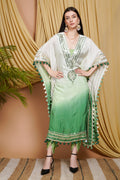 Radiate festive charm in this elegant green and white ombre kaftan suit crafted in organza. Embellished with dazzling mirror work and pom-pom lace, it offers a breezy silhouette—perfect for mehendi,...