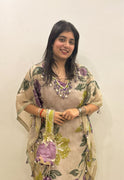 Grace your wardrobe with this floral printed organza suit, paired with a matching dupatta and stylish potli bag. Lightweight yet elegant, it’s perfect for festive occasions, evening gatherings, or celebrations, giving you a refined and sophisticated ethnic look.