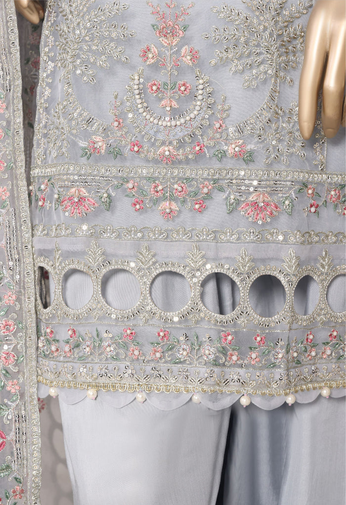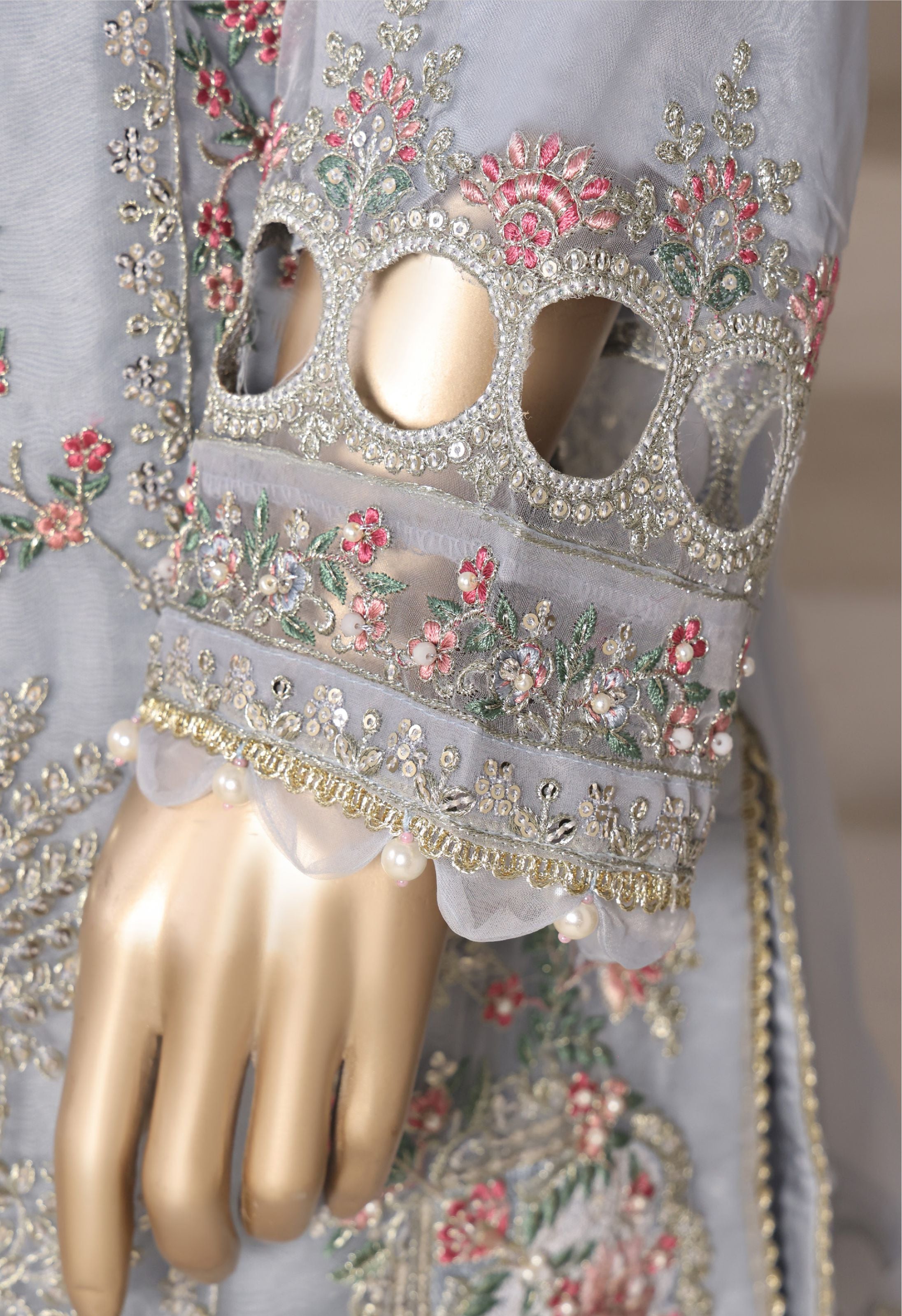 Exude timeless charm in this powder blue embroidered organza suit set, adorned with delicate hand embellishments and intricate cutwork. The refreshing pastel shade, paired with a Farshi Salwar and organza dupatta, makes it perfect for day functions, festive wear, and elegant celebrations.