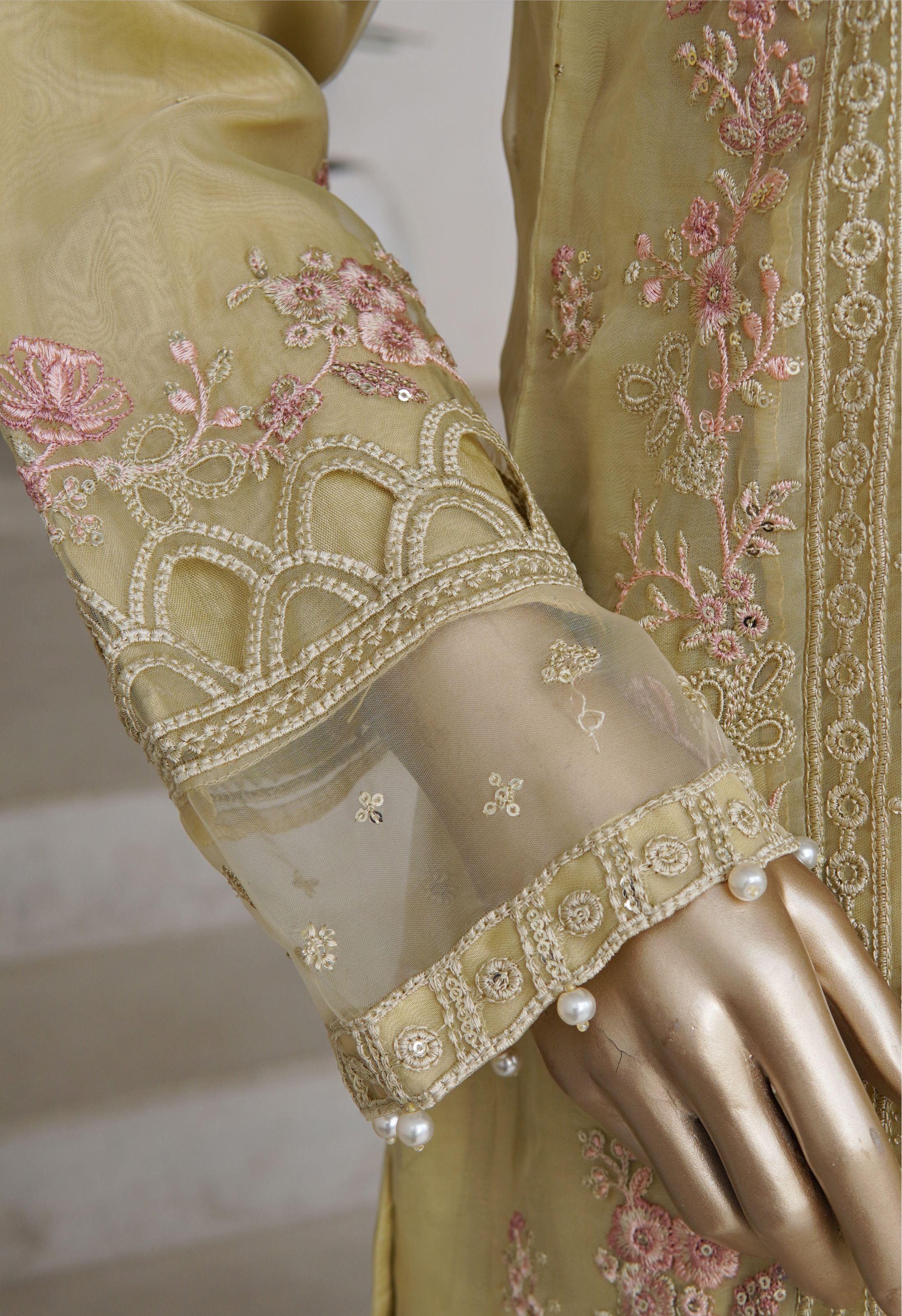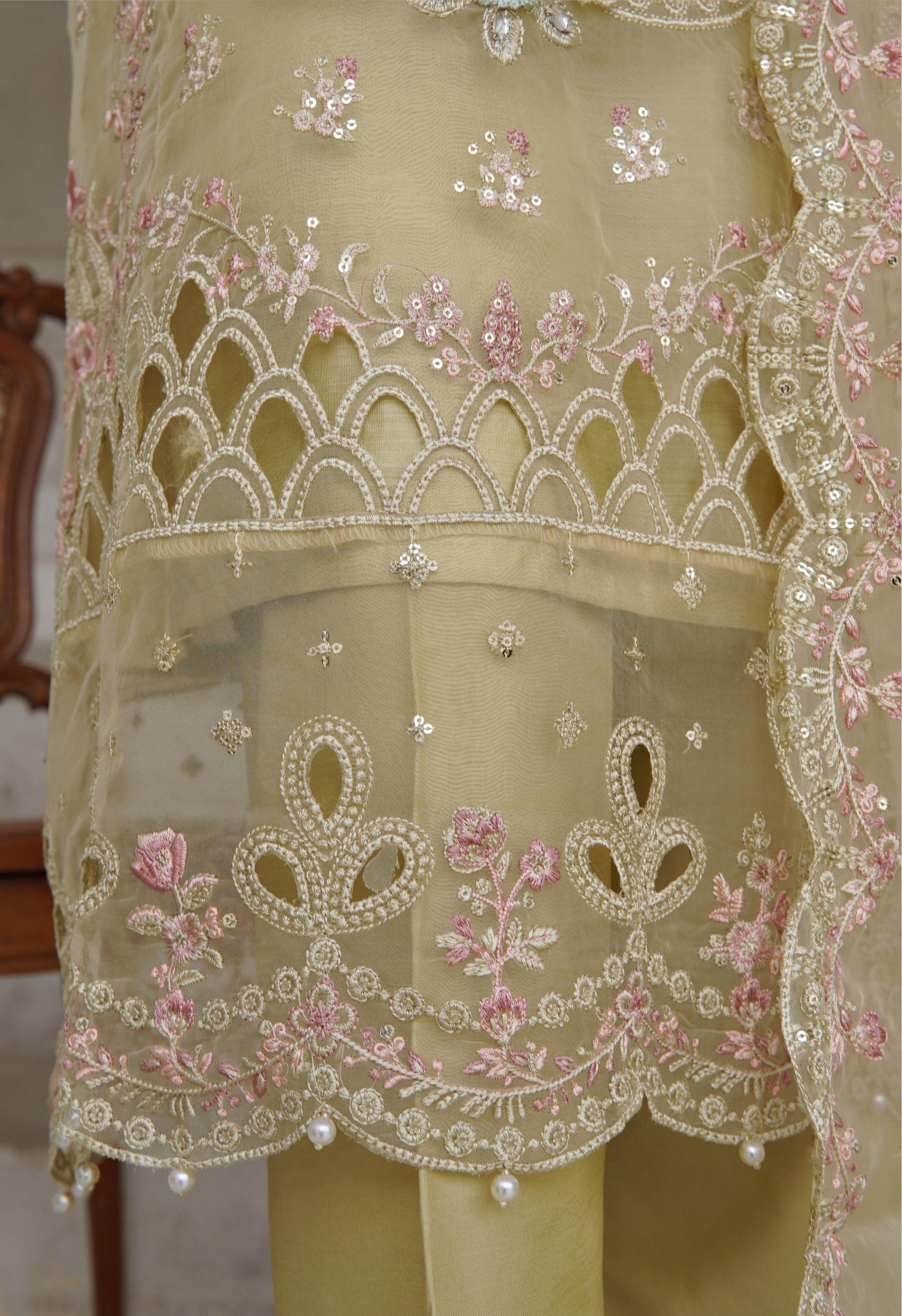 Brighten up your festive wardrobe with this yellow embroidered organza suit set, beautifully adorned with hand embellishments, floral embroidery, and cutwork borders. Paired with a stylish dupatta and straight pants, it’s perfect for haldi functions, weddings, and festive celebrations.