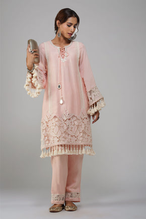 Pastel Pink cotton Tunic for women, designed for both comfort and charm. Crafted in breathable cotton, this outfit features delicate lace embroidery, tassel edging, and a stylish tie-up neckline for...