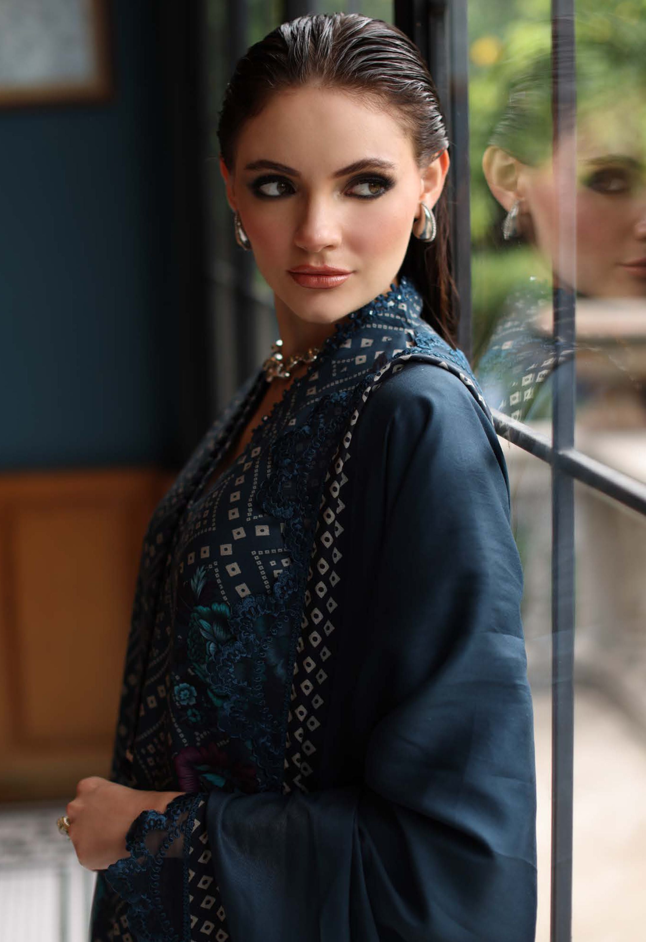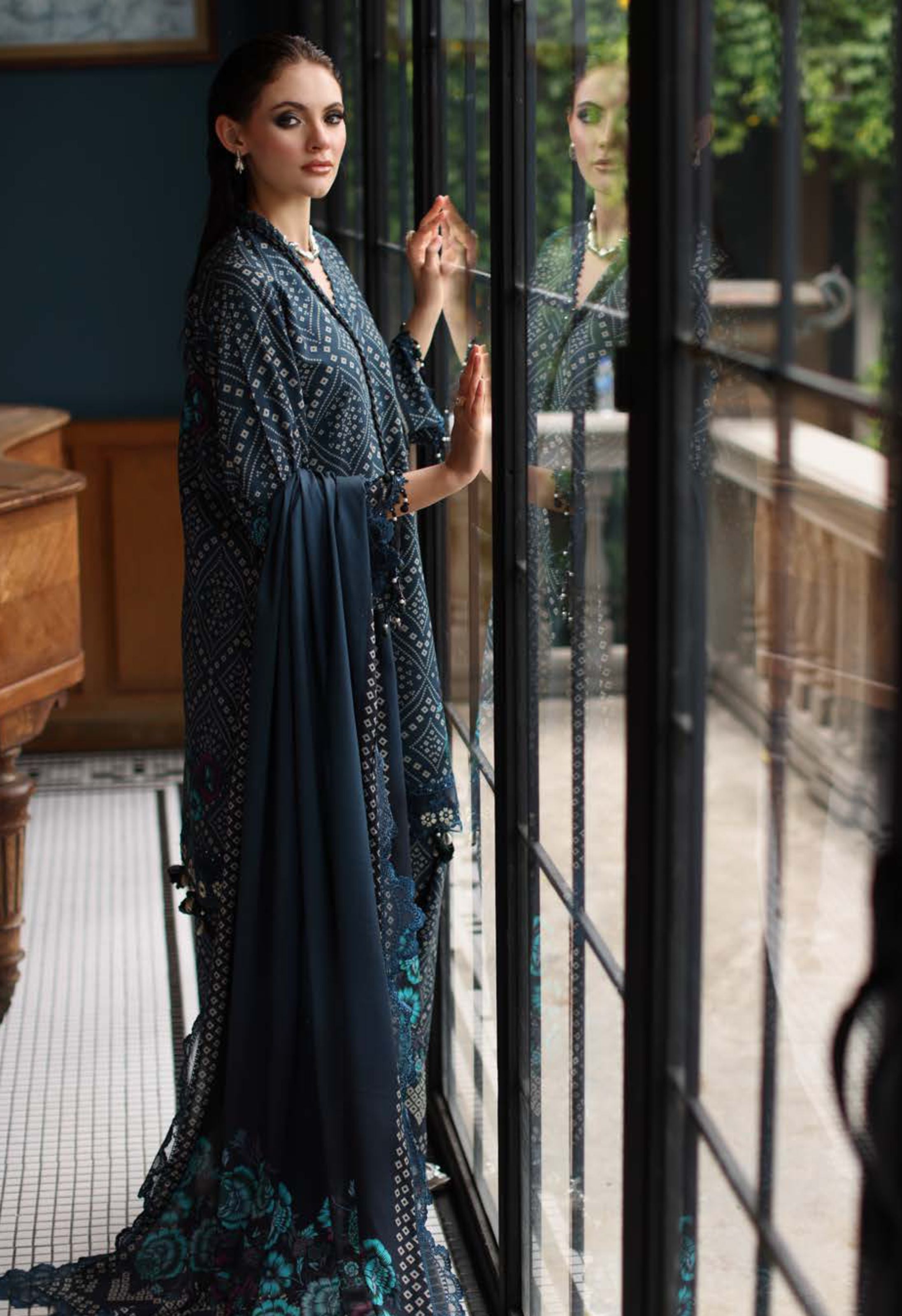 Step into refined elegance with Charizma’s embroidered printed linen suit set, showcasing intricate blue diamond motifs and delicate lace accents. The coordinated dupatta enhances its luxurious appeal, while breathable linen...
